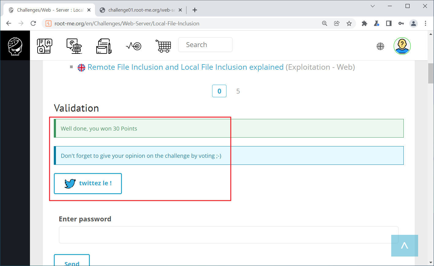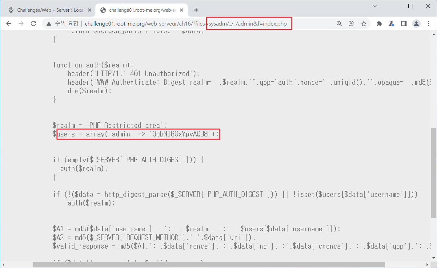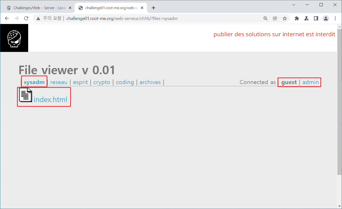 Season 1/워게임 [Root-Me]/Web Server/Local File Inclusion 작성자 - 한수임 문제풀이 바로 시작해보겠습니다. 1. 문제 Local File Inclusion(LFI) 주제네요. 2. 문제풀이 문제 접근 시 카테고리들이 존재하며, 아래 파일들이 존재하네요 connected as : guest | admin을 보아 admin을 접근해야 할 것만 같습니다. 힌트 또한 어드민 영역에 접근하라고 하네요. admin에 접근하니 ID/PW를 요구하네요. 여기에 접근할 수 있으면 문제가 해결될 것 같습니다. 먼저 LFI 답게 파일 경로 위에 무엇이 더 있는지 확인해 보겠습니다. 해당 파일 상위경로로 이동하니 카테고리들이 존재하였습니다. 한번 더 경로를 높혀보겠습니다. admin 파일이 존재하네요.... 파일에 접근해보겠습니다. admin 파일에 접근하니 index.php 파일이 존재하며 index.php 파일에 접근해보겠습니다. index.php 파일을 클릭하니 users에 admin으로 뭔가 관리자 ID/PW가 적혀있는 것만 같습니다. 해당 정보를 통해 로그인 시도를 해보겠습니다. 사용된 패스워드를 검증해보라는 것 같습니다. 해당 패스워드를 검증해보니.. 파랑새가 나오게 되었습니다. 오늘 문제풀이 끄읏~ 공유하기 게시글 관리 MSS 'Season 1 > 워게임' 카테고리의 다른 글 [Root-Me]/Web Server/File upload - Null byte (0) 2022.01.20 [Root-Me]/Web Server/File upload - MIME type (0) 2022.01.18 [Root-Me]/Web Server/File upload - Double extensions (0) 2022.01.14 [CodeEngn] Basic RCE L07 문제풀이 (0) 2021.12.31 [CodeEngn] Basic RCE L06 문제풀이 (0) 2021.12.30 Contents 당신이 좋아할만한 콘텐츠 [Root-Me]/Web Server/File upload - Null byte 2022.01.20 [Root-Me]/Web Server/File upload - MIME type 2022.01.18 [Root-Me]/Web Server/File upload - Double extensions 2022.01.14 [CodeEngn] Basic RCE L07 문제풀이 2021.12.31 댓글 0 + 이전 댓글 더보기