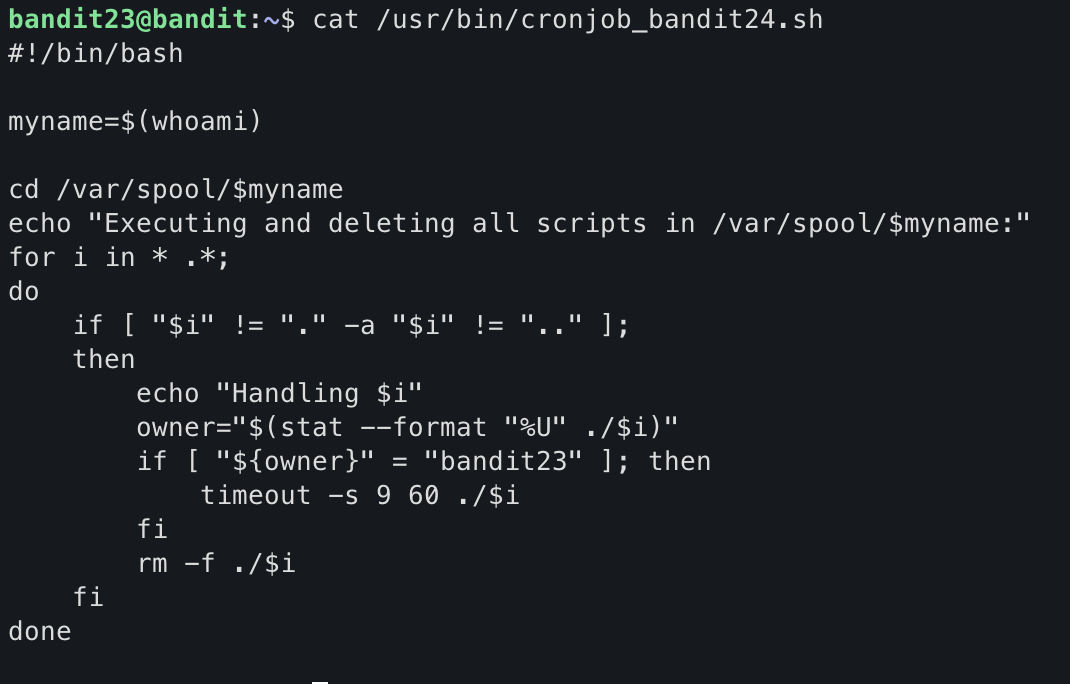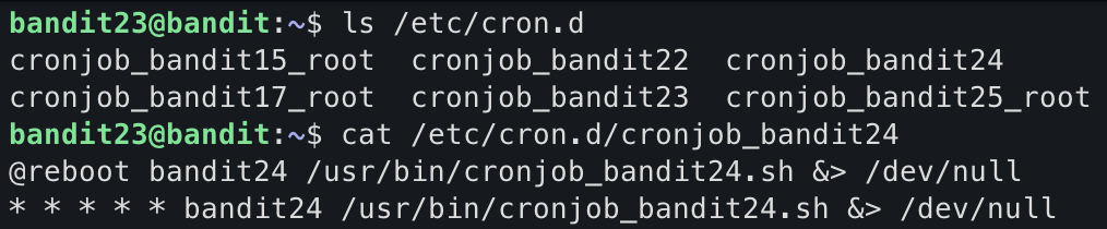 cron 설정 파일을 확인해보니, bandit24 사용자 권한으로 부팅할 때마다 /usr/bin/cronjob_bandit24.sh 파일을 실행하고 있었다. 또한 일정 시간에 실행한다는 곳이 모두 *으로 되어 있으면 1분 마다 실행된다는 뜻이니, 해당/usr/bin/cronjob_bandit24.sh 파일은 1분 마다 실행되고 있다.
