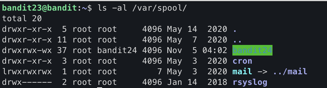 /var/spool 디렉토리에 무엇이 있는지 확인해보니, bandit24 디렉토리가 있는 것을 확인하였다. 하지만 권한을 보니, 다른 사용자한테는 Read 권한이 없었다. 즉, 해당 디렉토리를 ls 명령어로 통해 조회할 수 없다는 것이다.