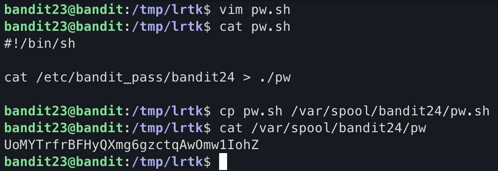 그래서 나는 최대한 빠르게 작업하기 위해 /tmp/lrtk 디렉토리에서 bandit24의 pw 파싱 쉘 스크립트를 생성 후 cp 명령어를 통해 빠르게 작업하는 방법을 선택하였다.