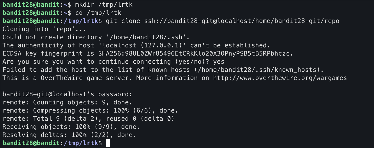 ssh://bandit28-git@localhost/home/bandit28-git/repo에 git 저장소가 있습니다. bandit28-git 사용자의 비밀번호는 bandit28 사용자의 비밀번호와 동일합니다.