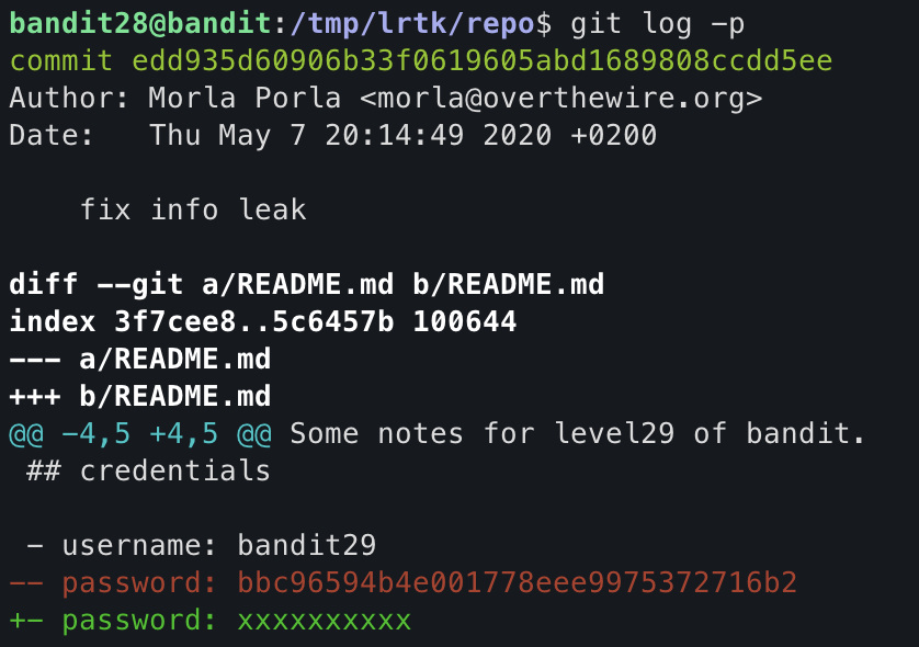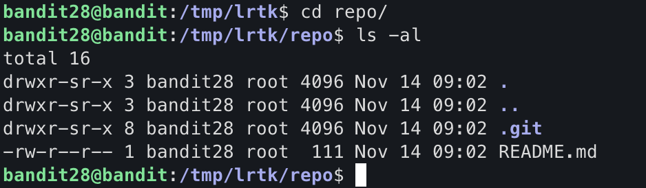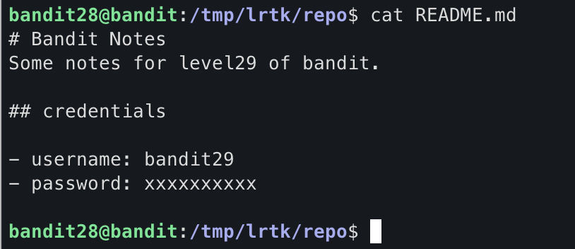 There is a git repository atssh://bandit28-git@localhost/home/bandit28-git/repo. The password for the userbandit28-gitis the same as for the userbandit28.