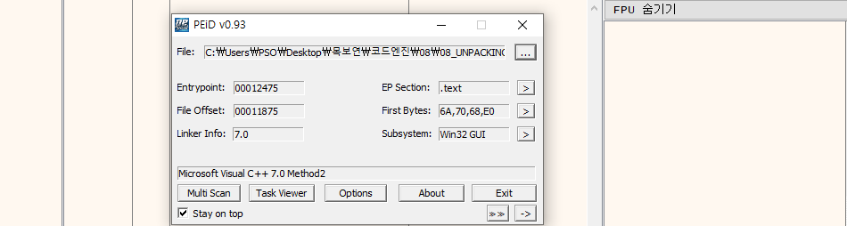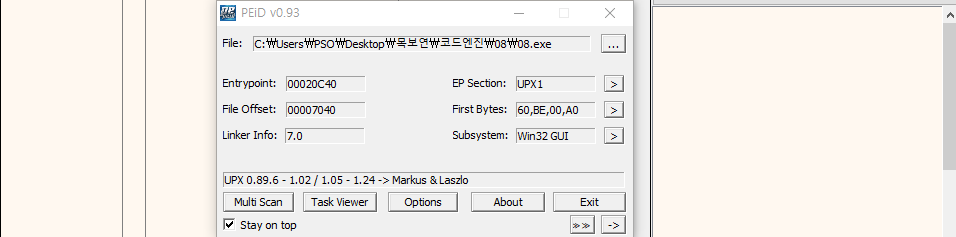 Season 1/워게임 [CodeEngn] Basic RCE L08 문제풀이 작성자 - S1ON 문제 정보 OEP를 구하시오 Ex) 00400000 풀이 힌트 2-1. OEP OEP란 Original Entry Point를 말한다. 패킹된 파일을 실행할 때 자동적으로 시스템 내부에서 언패킹을 한다. 언패킹이 끝나면 복구한 원본코드를 동작시켜야 하는데 이 원본코드의 Entry Point를 OEP라고 한다. 문제 풀이 더보기 ※ 패킹된 파일을 프로그램을 이용해 언패킹 하는 것과 디버깅을 통해 수동으로 OEP를 확인하는 방법이 존재하지만, 패킹된 파일이 깨져?있는 것 같아 본 문제에서는 자동으로 OEP를 획득하고, 다음 9번 문제에서는 수동으로 푸는 법을 작성했다. 3-1. PEiD를 통해 UPX로 패킹된 것을 확인하고, UPX 실행파일을 통해 언패킹을 수행한다. 3-2. 언패킹한 파일을 PEiD에 로드 시 엔트리 포인트를 확인할 수 있다. 3-5. OEP를 구하는 것이 문제이기 때문에 정답은 [00012475] 이다. 공유하기 게시글 관리 MSS 'Season 1 > 워게임' 카테고리의 다른 글 [dreamhack] session-basic 문제풀이 (0) 2022.05.26 [CodeEngn] Basic RCE L09 문제풀이 (0) 2022.01.30 [OverTheWire System - Bandit] Level 32 → Level 33 (0) 2022.01.20 [OverTheWire System - Bandit] Level 31 → Level 32 (0) 2022.01.20 [OverTheWire System - Bandit] Level 30 → Level 31 (0) 2022.01.20 Contents 당신이 좋아할만한 콘텐츠 [dreamhack] session-basic 문제풀이 2022.05.26 [CodeEngn] Basic RCE L09 문제풀이 2022.01.30 [OverTheWire System - Bandit] Level 32 → Level 33 2022.01.20 [OverTheWire System - Bandit] Level 31 → Level 32 2022.01.20 댓글 0 + 이전 댓글 더보기