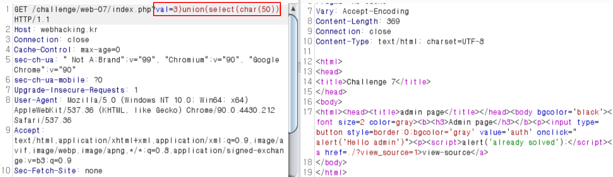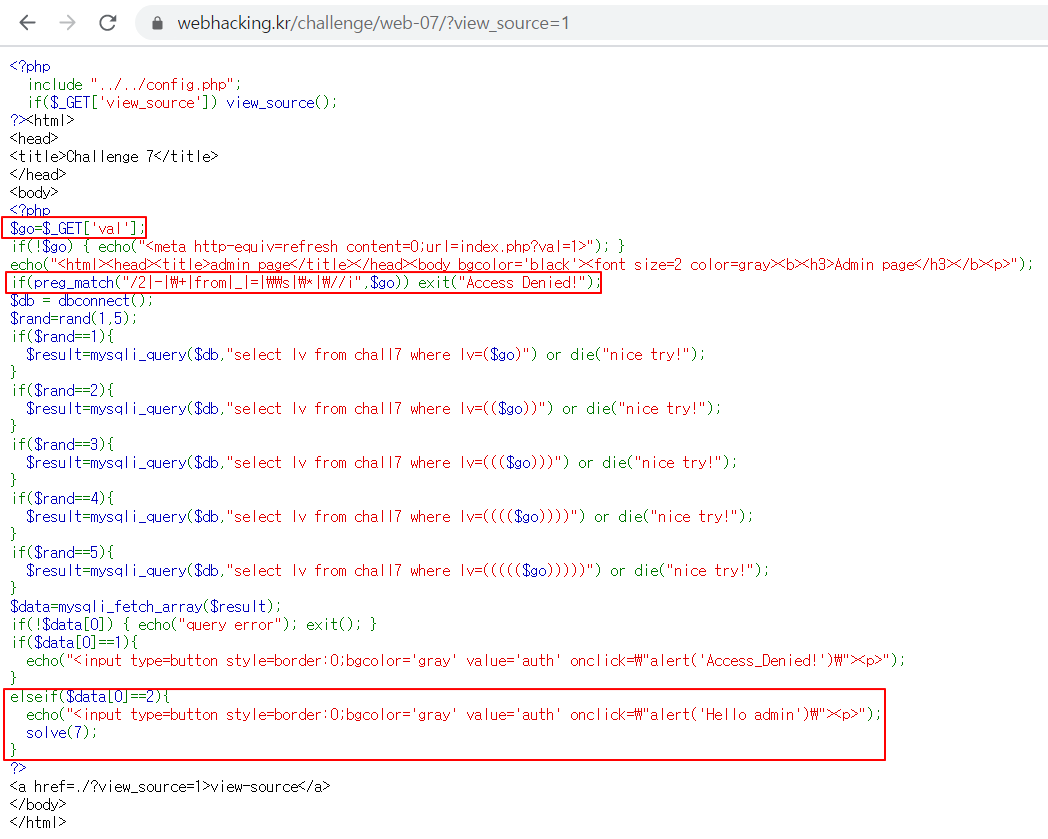 Season 1/워게임 Old - 07 작성자 - 알 수 없는 사용자 문제 메인화면 - 문제 접속 시 메인 화면이다. - url 파라미터로 val이 전달되는 것을 확인 - view-source를 클릭! view-source - url파라미터로 전달된 val이 preg_match() 함수를 통해 필터링되는 것을 확인 - 필터링을 우회하여 sql injection 공격 수행, 결과 값으로 2를 받아오면 문제 해결 - 필터링되는 문자 2, -, +, from, _, =, 공백, *, / - 숫자 2가 필터링되므로 char() 함수를 이용, 아스키코드로 문자를 지정 - val=char(50)으로 설정하여 시도 결과 - query error 발생 - sql injection은 성공하였으나 테이블에 lv=2 값이 존재하지 않아 query error발생 - sql문을 통해 직접 결과값을 2로 반환하도록 시도 - val = 3)union select char(50 로 설정하여 기존의 sql문을 종료하고 2를 반환하는 sql문 설정 - db에 질의되는 sql문 = "select lv from chall7 where lv=(3)union select char(50)" - 공백 필터링을 우회하기 위해 괄호를 사용 val = 3)union(select(char(50)) 문제 해결 공유하기 게시글 관리 MSS 'Season 1 > 워게임' 카테고리의 다른 글 Old - 27 Write Up (0) 2021.05.16 Old - 19 Write Up (0) 2021.05.16 Old - 54 Write Up (0) 2021.05.15 Old - 39 Write Up (0) 2021.05.15 Old - 38 Write Up (0) 2021.05.15 Contents 당신이 좋아할만한 콘텐츠 Old - 27 Write Up 2021.05.16 Old - 19 Write Up 2021.05.16 Old - 54 Write Up 2021.05.15 Old - 39 Write Up 2021.05.15 댓글 0 + 이전 댓글 더보기