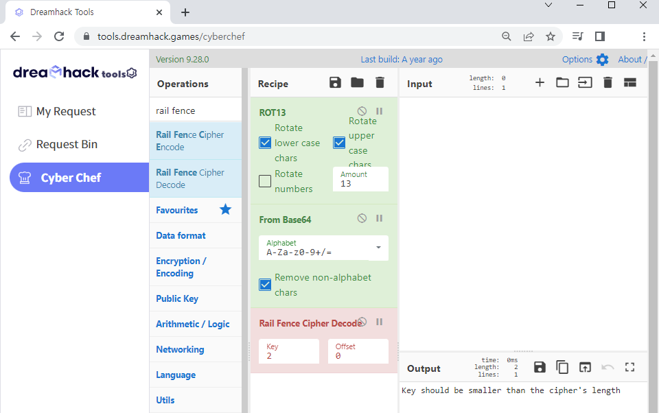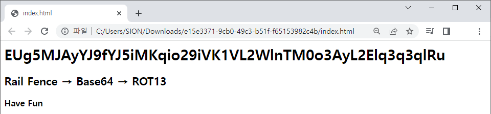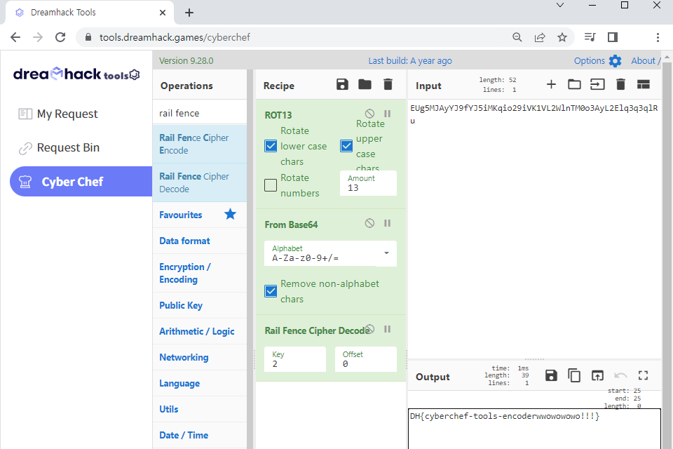 Season 1/워게임 [dreamhack] dreamhack-tools-cyberchef 문제풀이 작성자 - S1ON 1. 드림핵에서 제공하는 cyberchef 툴을 이용해서 푸는 문제이다. 문제 파일을 다운로드하자. 2. 다운로드 받은 index.html을 브라우저로 실행하면 이상한 문자열과 인코딩 기법이 보인다. 뭔지 확인해보자. - Rail Fence : 평문의 순서를 재배치하여 암호화 하는 고전 암호이다. > 암호화 키가 1324인 평문 "TEST"의 암호화 결과는 "TTES"이다. - Base64 : Binary Data를 Text로 바꾸는 인코딩이다. > 이진 데이터를 6bit씩 자른 뒤 6bit에 해당하는 문자를 Base64 표에서 찾아 치환한다. 이진 데이터의 길이가 6bit로 딱 떨어지지 않을경우, 남는 비트 뒤에 0을 채워 6비트를 만들어내며 해당하는 문자 뒤에 패딩문자를 나타내는 "="가 추가된다. > 평문 "test"를 Base64로 인코딩한 결과는 "dGVzdA==" 이다. - ROT13 : 카이사르 암호의 일종으로 영어 알파벳을 13글자씩 밀어서 만드는 고전 암호이다. > 평문 "test"를 Base64로 암호화한 결과는 "grfg" 이다. 3. index.html에서 확인한 문자열은 평문을 Rail Fence 암호화, BASE64 인코딩, ROT13 암호화를 수행한 것으로 보인다. 따라서 문제에서 제공하는 드림핵 cyberchef를 이용해 반대로 복호화 기법을 차례로 적용해보자. 4. 문제에서 확인한 암호화 문자열을 input data에 입력하면 플래그를 확인할 수 있다. 문제풀이 끗 공유하기 게시글 관리 MSS 저작자표시 비영리 (새창열림) 'Season 1 > 워게임' 카테고리의 다른 글 [Android] 02. 하드코딩 이슈 - Part 1 (0) 2022.11.29 [Android] 01. 취약한 로깅 (0) 2022.11.29 [dreamhack] session-basic 문제풀이 (0) 2022.05.26 [CodeEngn] Basic RCE L09 문제풀이 (0) 2022.01.30 [CodeEngn] Basic RCE L08 문제풀이 (0) 2022.01.30 Contents 당신이 좋아할만한 콘텐츠 [Android] 02. 하드코딩 이슈 - Part 1 2022.11.29 [Android] 01. 취약한 로깅 2022.11.29 [dreamhack] session-basic 문제풀이 2022.05.26 [CodeEngn] Basic RCE L09 문제풀이 2022.01.30 댓글 0 + 이전 댓글 더보기