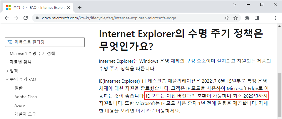 Microsoft Edge에서 IE 브라우저의 서비스 종료로 인해 기존 웹 사이트와의 이전 버전과의 호환성을 위해 IE(Internet Explorer) 모드를 만들어서 제공한다. Edge의 버전 v77(19년 8월 13일) 이상부터 IE 모드가 제공되며 해당 모드는