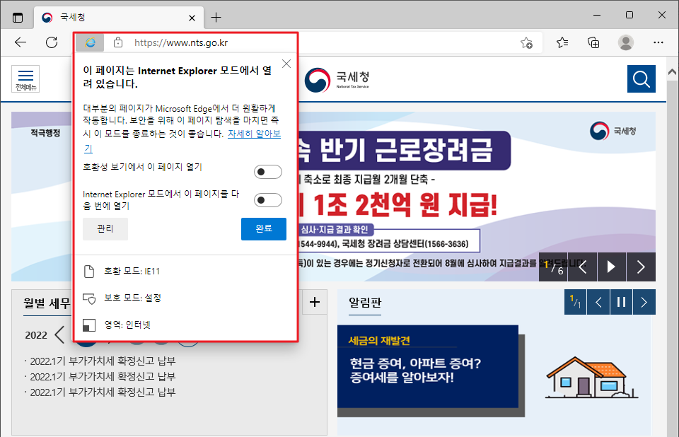 국세청 웹 사이트에서 IE 모드로 다시 로드를 시도하면 IE11 버전으로 페이지가 재로드 된 것을 확인할 수 있다.
