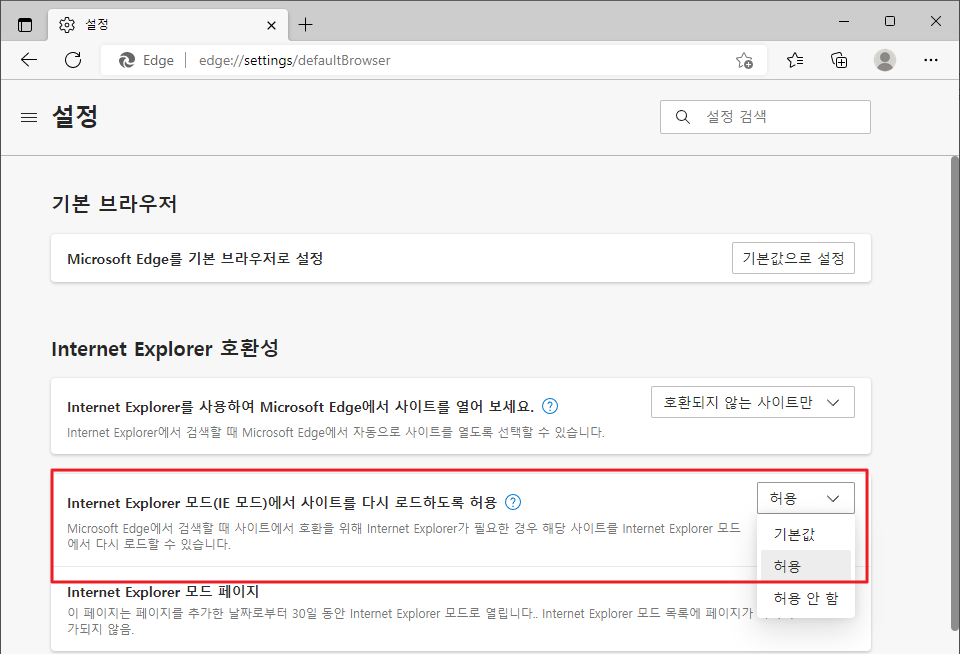 Edge에서 IE 모드를 사용하기 위해서는 브라우저에서 별도로 "IE 모드 허용" 설정을 해야한다.