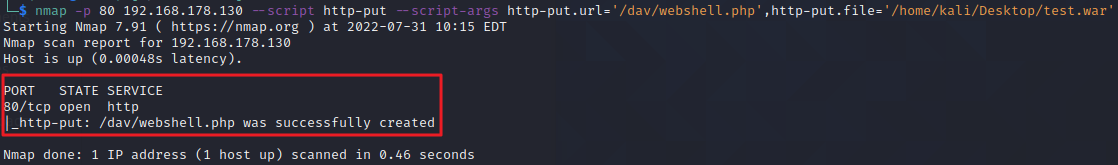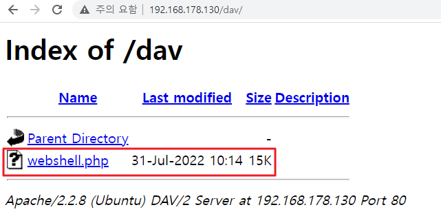 PUT 메소드를 활용하여 웹쉘 업로드 및 실행 → 해당 경로 내에 웹쉘 업로드 가능함 확인