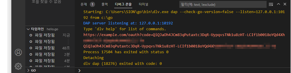 코드를 실행하면 다음과 같이 Location 헤더 값으로 응답받는 엑세스 토큰 값을 획득하여 AUTHORIZE_CODE 변수에 저장하고 값이 출력된다.
