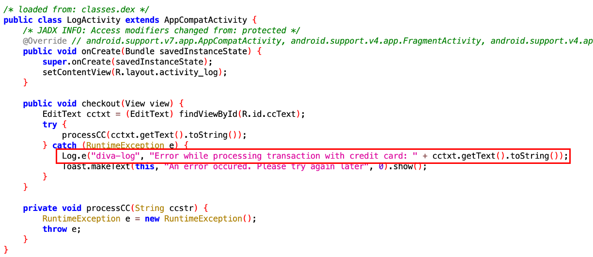 Season 1/워게임 [Android] 01. 취약한 로깅 작성자 - LRTK 문제풀이 목표 : 기록되는 위치/방법 및 취약한 코드를 찾으십시오. 힌트 : 안전하지 않은 로깅은 개발자가 자격 증명, 세션 ID, 금융 세부 정보 등과 같은 민감한 정보를 내부적으로 또는 비간섭적으로 기록할 때 발생합니다. 일단 임의의 숫자를 삽입하여 CHECK OUT 버튼을 클릭 시 "An error occured.Please try again later"이라는 오류 문구를 Toast로 띄어줬다. adb shell ps | grep "diva" 명령을 통해 디바이스에서 실행 중인 DIVA 어플리케이션의 PID를 확인을 하였다. 확인한 PID를 adb logcat의 pid 옵션에 넣어 DIVA 어플리케이션의 로그만 출력하도록 설정하였다. 출력된 로그에서 입력한 값을 검색해보니, 평문으로 출력되는 것을 확인할 수 있었다. LogActivity.java 코드에서 확인한 결과, 사진 속 빨간 색 박스 내의 코드로 인하여 입력한 값이 Logcat에 출력되었다. 공유하기 게시글 관리 MSS 저작자표시 비영리 (새창열림) 'Season 1 > 워게임' 카테고리의 다른 글 [Android] 03. 취약한 데이터 저장소 - Part 1 (0) 2022.11.29 [Android] 02. 하드코딩 이슈 - Part 1 (0) 2022.11.29 [dreamhack] dreamhack-tools-cyberchef 문제풀이 (0) 2022.05.31 [dreamhack] session-basic 문제풀이 (0) 2022.05.26 [CodeEngn] Basic RCE L09 문제풀이 (0) 2022.01.30 Contents 당신이 좋아할만한 콘텐츠 [Android] 03. 취약한 데이터 저장소 - Part 1 2022.11.29 [Android] 02. 하드코딩 이슈 - Part 1 2022.11.29 [dreamhack] dreamhack-tools-cyberchef 문제풀이 2022.05.31 [dreamhack] session-basic 문제풀이 2022.05.26 댓글 0 + 이전 댓글 더보기