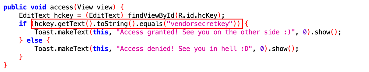 Season 1/워게임 [Android] 02. 하드코딩 이슈 - Part 1 작성자 - LRTK 문제풀이 목표: 하드코딩된 항목과 위치를 알아냅니다. 힌트: 개발자는 때때로 쉽게 민감한 정보를 하드코딩합니다. 임의의 숫자를 삽입하여 ACCESS 버튼을 클릭 시 "Access denied! See you in hell :D"이라는 실패 문구를 Toast로 출력되었다. HardcodeActivity.java 코드를 살펴보니, 입력값이 vendorsecretkey이라는 문구와 일치하면 "Acccess granted! See you on the other side :)"이라는 인증 성공 문구를 Toast로 출력하는 것을 확인할 수 있다. 실제 앱에서 vendorsecretkey를 삽입하여 요청 시 인증 성공 문구가 출력되었다. 공유하기 게시글 관리 MSS 저작자표시 비영리 (새창열림) 'Season 1 > 워게임' 카테고리의 다른 글 [Android] 04. 취약한 데이터 저장소 - Part 2 (0) 2022.11.29 [Android] 03. 취약한 데이터 저장소 - Part 1 (0) 2022.11.29 [Android] 01. 취약한 로깅 (0) 2022.11.29 [dreamhack] dreamhack-tools-cyberchef 문제풀이 (0) 2022.05.31 [dreamhack] session-basic 문제풀이 (0) 2022.05.26 Contents 당신이 좋아할만한 콘텐츠 [Android] 04. 취약한 데이터 저장소 - Part 2 2022.11.29 [Android] 03. 취약한 데이터 저장소 - Part 1 2022.11.29 [Android] 01. 취약한 로깅 2022.11.29 [dreamhack] dreamhack-tools-cyberchef 문제풀이 2022.05.31 댓글 0 + 이전 댓글 더보기