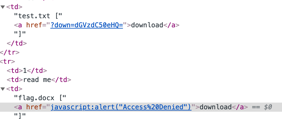 Season 1/워게임 Old - 42 Write Up 작성자 - LRTK 다운로드을 클릭하니, test.txt는 다운로드가 가능하였고, flag.docx은 다운로드가 불가능하였다. test123 qwer123 asdf234 test.txt 내용을 살펴보니, 의미를 알 수 없는 글자들이 있었다.일단 힌트나 암호일 수도 있으니 참고만 하고, 개발자 도구로 다운로드 경로를 살펴보았다. test.txt의 다운로드 경로를 보니, 끝에가 =로 되어있었다.이것을 보고 base64로 인코딩이 되어있다는 것을 판단하여 디코딩을 시도하였다. Base64 디코딩을 해보니, test.txt로 나왔다.이를 통해 난 flag.docx를 base64로 인코딩하여 down 파라미터에 넣어서 서버로 요청하였다. 요청을 하니, flag.docx가 다운로드가 되었다. 다운로드한 파일을 열어보니, flag를 얻을 수 있었다. 공유하기 게시글 관리 MSS 'Season 1 > 워게임' 카테고리의 다른 글 Old - 61 Write Up (0) 2021.05.17 Old - 59 Write Up (0) 2021.05.17 Old - 36 Write Up (0) 2021.05.17 Old - 33 Write Up (0) 2021.05.17 Old - 23 Write Up (0) 2021.05.17 Contents 당신이 좋아할만한 콘텐츠 Old - 61 Write Up 2021.05.17 Old - 59 Write Up 2021.05.17 Old - 36 Write Up 2021.05.17 Old - 33 Write Up 2021.05.17 댓글 0 + 이전 댓글 더보기