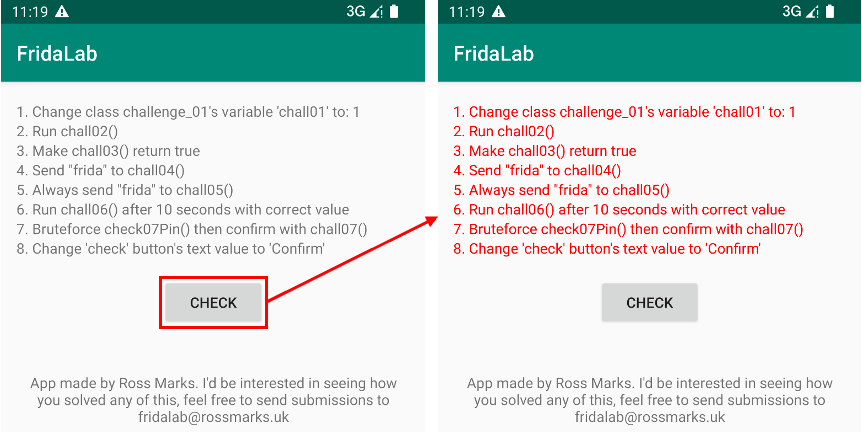 FridaLab의 기능은 화면 속 텍스트로 작성한 1~8번의 기능들이 우회가 되었는지 확인하는 것 뿐이다.