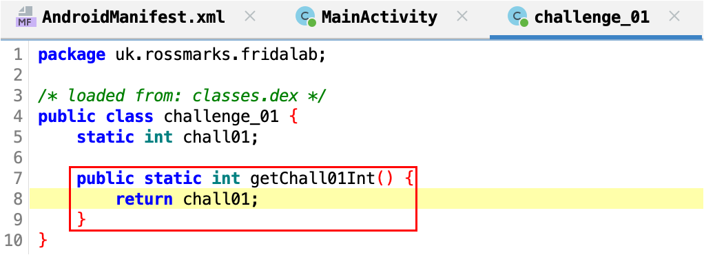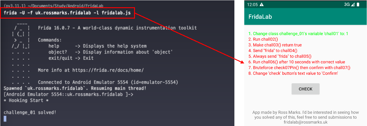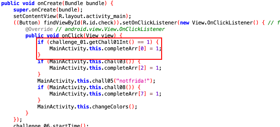 Season 1/워게임 FridaLab Write Up - Challenge 01. challenge_01 클래스의 chall01 변수의 값을 1로 변경해라 작성자 - LRTK 코드 설명 MainActivity challenge_01 chall01이라는 이름의 클래스 변수가 int 타입으로 선언만 되어있다. MainActivity에서 호출되는 getChall01Int 메소드에선 chall01 클래스 변수에 값을 지정하지 않았기 때문에 chall01 클래스 변수에 지정된 값은 0으로 지정되어 리턴하게 된다. MainActivity에서 getChall01Int 메소드의 반환 값과 1을 비교하였는데, 이는 틀리기 때문에 동작하지 않는다. Write Up Java.perform(function () { console.log("\n* Hooking Start *") var challenge01 = () => { var chall_01 = Java.use("uk.rossmarks.fridalab.challenge_01") chall_01.chall01.value = 1 console.log("\nchallenge_01 solved!") } challenge01() }) Java.use 함수를 통해 후킹할 클래스를 지정한 후 chall01의 값을 1로 변경하였다. 후킹 스크립트를 Frida를 통해 FridaLab 앱의 프로세스에 삽입 후 CHECK 버튼 클릭 시 Challeng 01의 글자 색이 초록색으로 변하는 것을 확인 할 수 있다. 사용된 API Java.perform(Fn)Frida에 요청된 Hooking 대상이 onResume()이 호출된 후 Function이 실행되는 것이다.즉, Hooking 대상이 Dalvik VM에 실행되는지 확인 후 Function을 호출한다는 뜻이다.Frida에 요청된 Hooking 대상이 Dalvik VM에 실행되지 전에 Function을 호출하는 것은 Java.performNow(Fn)이다. Java.use(Class Name)변수와 메소드에 접근할 수 있는 클래스 객체를 반환하는 메소드이다. 공유하기 게시글 관리 MSS 저작자표시 비영리 (새창열림) 'Season 1 > 워게임' 카테고리의 다른 글 FridaLab Write Up - Challenge 03. Chall03()의 리턴 값을 True로 만들어라. (0) 2022.12.15 FridaLab Write Up - Challenge 02. chall02()를 실행 시켜라. (0) 2022.12.15 FridaLab Write Up - Download & Install (0) 2022.12.15 [Android] 13. 입력 유효성 검사 문제 - Part 3 (0) 2022.11.29 [Android] 12. 하드코딩 이슈 - Part 2 (0) 2022.11.29 Contents 당신이 좋아할만한 콘텐츠 FridaLab Write Up - Challenge 03. Chall03()의 리턴 값을 True로 만들어라. 2022.12.15 FridaLab Write Up - Challenge 02. chall02()를 실행 시켜라. 2022.12.15 FridaLab Write Up - Download & Install 2022.12.15 [Android] 13. 입력 유효성 검사 문제 - Part 3 2022.11.29 댓글 0 + 이전 댓글 더보기