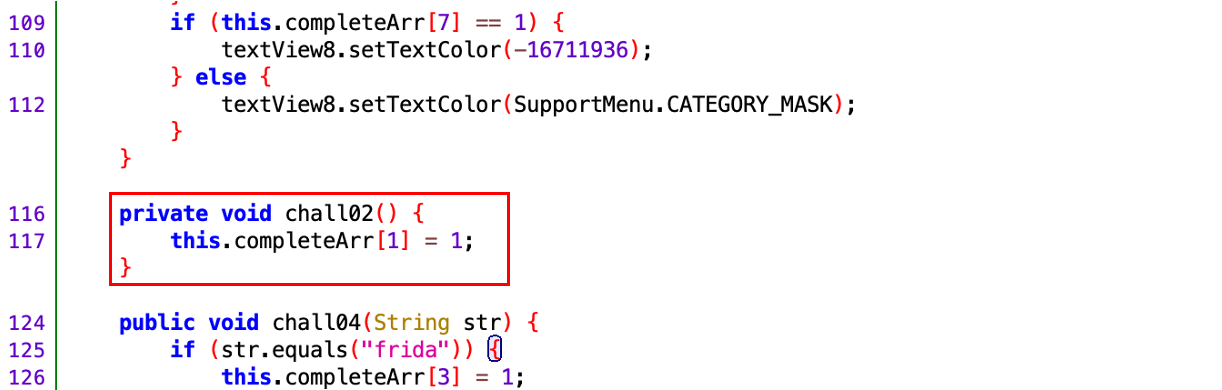 앞서 코드 분석에서 MainActivity 클래스의 chall02 메소드가 클래스 메소드가 아닌 인스턴스 메소드인 것을 확인하였다. 그래서 인스턴스 메소드를 동작 하게끔 하는 API인 Java.choose 메소드를 사용하여 chall02 메소드를 동작시켰다.