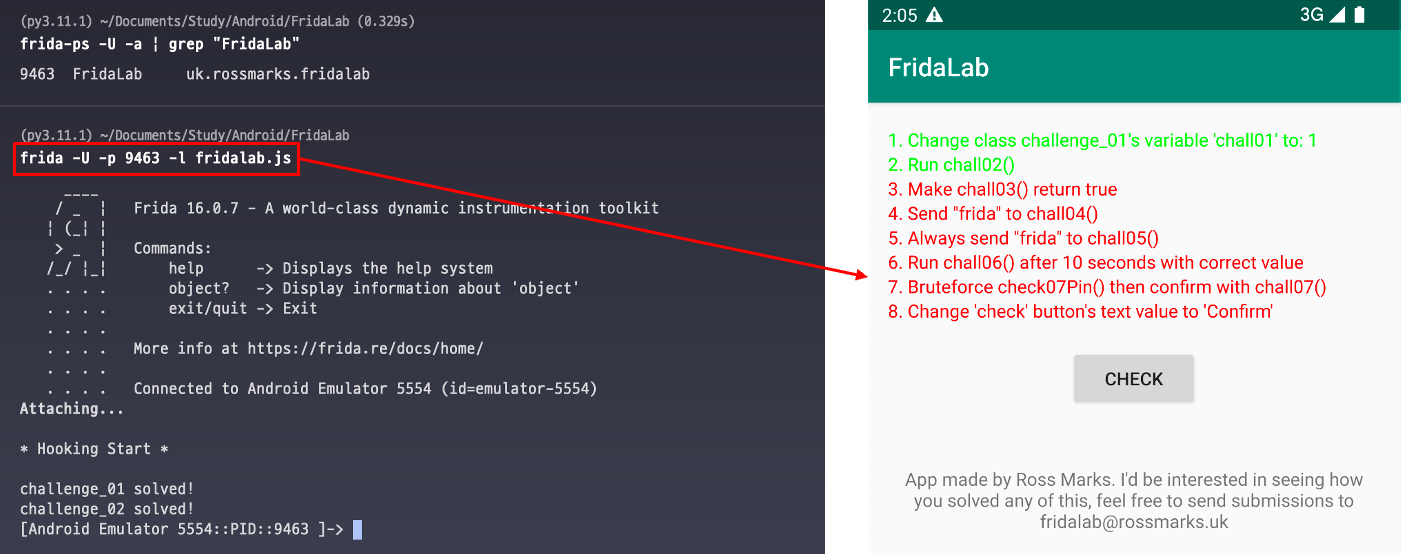 1번 문제와 다른 점은 frida-client에서 -f 옵션을 사용하여 Hooking 대상을 지정한 것이 아닌 -p 옵션을 사용하여 미리 실행된 Hooking 대상을 지정하였다. 이렇게 한 이유는 Client 측에서 Frida의 -f 옵션을 사용할 때 Java.choose 메소드가 인스턴스 메소드를 제대로 인식 못 하는 문제점이 발생하였다.