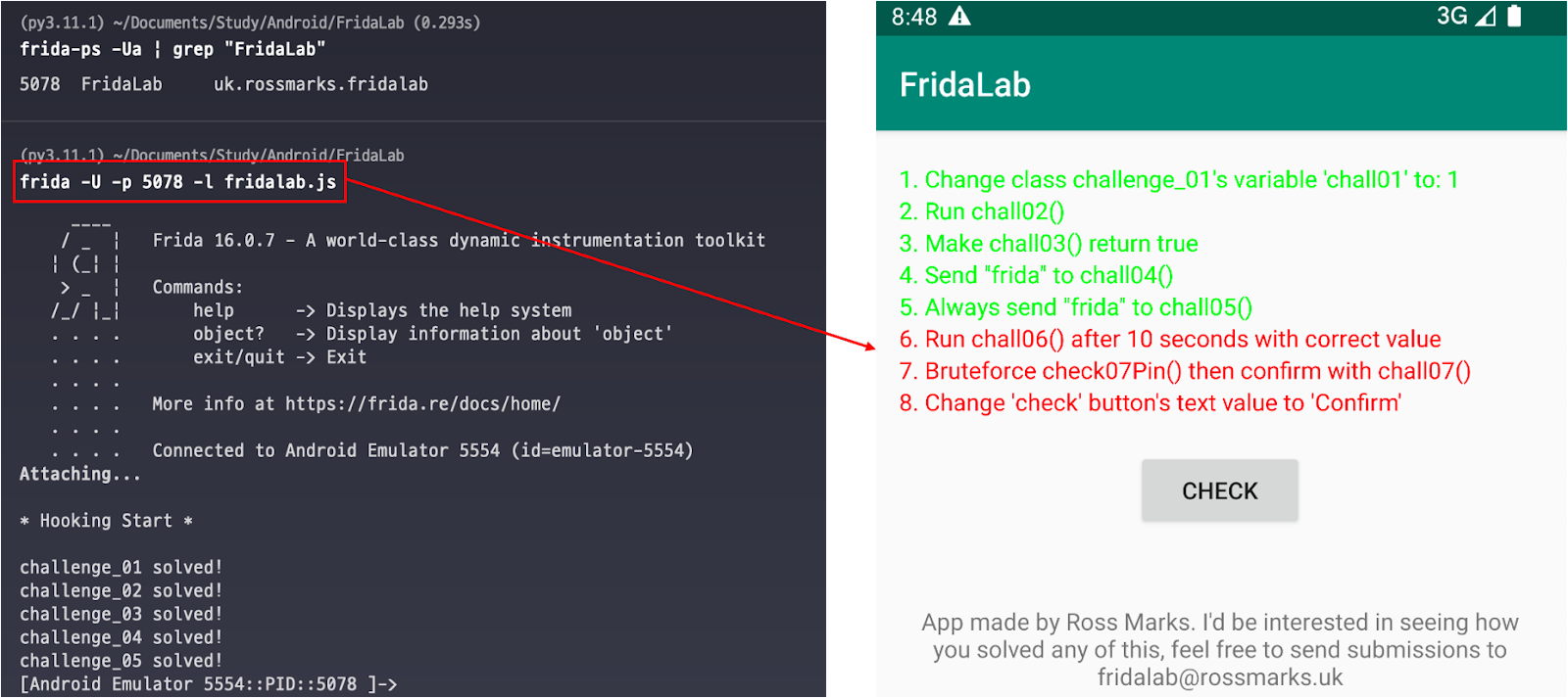 Season 1/워게임 FridaLab Write Up - Challenge 05. 항상 chall05()에 "frida"를 전송하라. 작성자 - LRTK 코드 분석 MainActivity MainActivity에서 CHECK 버튼 클릭 시 chall05()를 호출하는 것을 확인할 수 있다. 하지만, 호출 시 파라미터 값으로 문자열 "notfrida!"을 넘김으로 completeArr의 4번째 인덱스 값이 0으로 지정된다. Write Up Java.perform(() => { console.log("\n* Hooking Start *") var challenge05 = () => { var MainActivity = Java.use("uk.rossmarks.fridalab.MainActivity") MainActivity.chall05.overload('java.lang.String').implementation = function (arg) { this.chall05("frida") } console.log("challenge_05 solved!") } // Hooking Function Call challenge05() }) 오버로딩을 통해 chall05()를 호출 시 chall05("frida")로 호출되도록 후킹하여 문제 해결을 하였다. 공유하기 게시글 관리 MSS 저작자표시 비영리 (새창열림) 'Season 1 > 워게임' 카테고리의 다른 글 FridaLab Write Up - Challenge 07. check07Pin()의 chall07 변수 검증을 무차별 대입 공격을 통해 통과하라. (0) 2022.12.15 FridaLab Write Up - challenge 06. 적절한 값을 사용하여 10초 후 chall06()를 동작시켜라. (0) 2022.12.15 FridaLab Write Up - Challenge 04. chall04()에 "Frida"를 전달하라. (0) 2022.12.15 FridaLab Write Up - Challenge 03. Chall03()의 리턴 값을 True로 만들어라. (0) 2022.12.15 FridaLab Write Up - Challenge 02. chall02()를 실행 시켜라. (0) 2022.12.15 Contents 당신이 좋아할만한 콘텐츠 FridaLab Write Up - Challenge 07. check07Pin()의 chall07 변수 검증을 무차별 대입 공격을 통해 통과하라. 2022.12.15 FridaLab Write Up - challenge 06. 적절한 값을 사용하여 10초 후 chall06()를 동작시켜라. 2022.12.15 FridaLab Write Up - Challenge 04. chall04()에 "Frida"를 전달하라. 2022.12.15 FridaLab Write Up - Challenge 03. Chall03()의 리턴 값을 True로 만들어라. 2022.12.15 댓글 0 + 이전 댓글 더보기