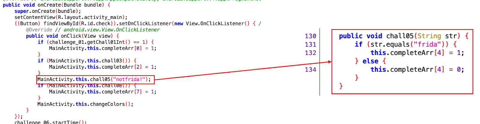 Season 1/워게임 FridaLab Write Up - Challenge 05. 항상 chall05()에 "frida"를 전송하라. 작성자 - LRTK 코드 분석 MainActivity MainActivity에서 CHECK 버튼 클릭 시 chall05()를 호출하는 것을 확인할 수 있다. 하지만, 호출 시 파라미터 값으로 문자열 "notfrida!"을 넘김으로 completeArr의 4번째 인덱스 값이 0으로 지정된다. Write Up Java.perform(() => { console.log("\n* Hooking Start *") var challenge05 = () => { var MainActivity = Java.use("uk.rossmarks.fridalab.MainActivity") MainActivity.chall05.overload('java.lang.String').implementation = function (arg) { this.chall05("frida") } console.log("challenge_05 solved!") } // Hooking Function Call challenge05() }) 오버로딩을 통해 chall05()를 호출 시 chall05("frida")로 호출되도록 후킹하여 문제 해결을 하였다. 공유하기 게시글 관리 MSS 저작자표시 비영리 (새창열림) 'Season 1 > 워게임' 카테고리의 다른 글 FridaLab Write Up - Challenge 07. check07Pin()의 chall07 변수 검증을 무차별 대입 공격을 통해 통과하라. (0) 2022.12.15 FridaLab Write Up - challenge 06. 적절한 값을 사용하여 10초 후 chall06()를 동작시켜라. (0) 2022.12.15 FridaLab Write Up - Challenge 04. chall04()에 "Frida"를 전달하라. (0) 2022.12.15 FridaLab Write Up - Challenge 03. Chall03()의 리턴 값을 True로 만들어라. (0) 2022.12.15 FridaLab Write Up - Challenge 02. chall02()를 실행 시켜라. (0) 2022.12.15 Contents 당신이 좋아할만한 콘텐츠 FridaLab Write Up - Challenge 07. check07Pin()의 chall07 변수 검증을 무차별 대입 공격을 통해 통과하라. 2022.12.15 FridaLab Write Up - challenge 06. 적절한 값을 사용하여 10초 후 chall06()를 동작시켜라. 2022.12.15 FridaLab Write Up - Challenge 04. chall04()에 "Frida"를 전달하라. 2022.12.15 FridaLab Write Up - Challenge 03. Chall03()의 리턴 값을 True로 만들어라. 2022.12.15 댓글 0 + 이전 댓글 더보기