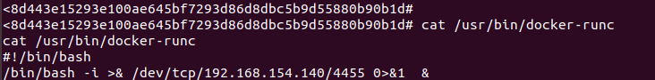 8.쉘에서 docker-runc 바이너리 파일이 공격자 PC로 netcat 연결을 시도하는 명령어로 덮어씌워진 것을 확인할 수 있다.