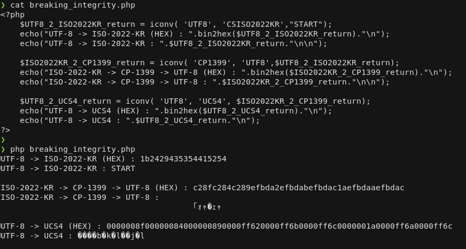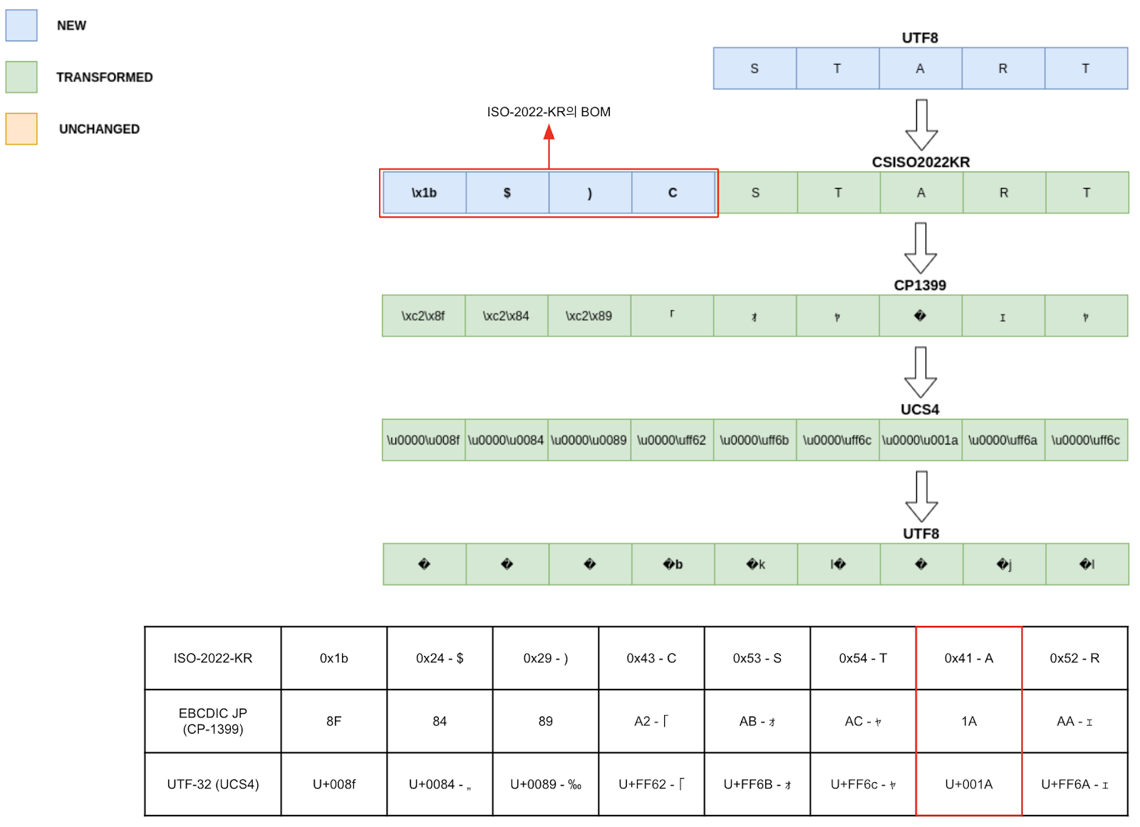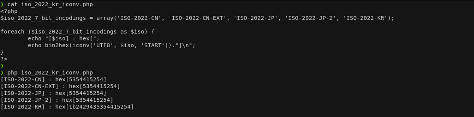 ISO-2022-KR 인코딩은 ISO-2022-CN, ISO-2022-CN-EXT, ISO-2022-JP, ISO-2022-JP-2와 함께 7 Bit로 사용되는 ISO-2022 코드 버전 중 하나입니다. 그러나 ISO-2022-KR은 iconv 함수에서 사용 가능한 유일한 인코딩입니다. (국뽕…?)