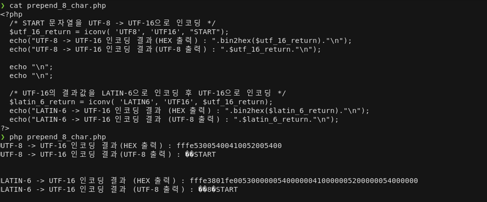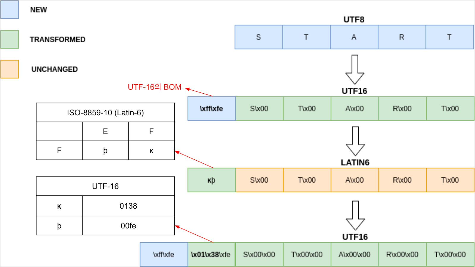 위와 같이 UTF-8 → UTF-16 → LATIN-6 → UTF-16으로 인코딩을 진행하면, UTF-16의 BOM(\xFF\xFE)이 LATIN-6으로 인코딩되면서 ĸþ으로 변경됩니다. 또 다시 UTF-16으로 인코딩하면, UTF-16의 BOM이 문자열 앞에 붙으면서 ĸþ을 문자열로 구분하여 UTF-16의 테이블에 정의된 ĸþ의 값 (\x01\x38\x00\xFE)으로 변경됩니다.