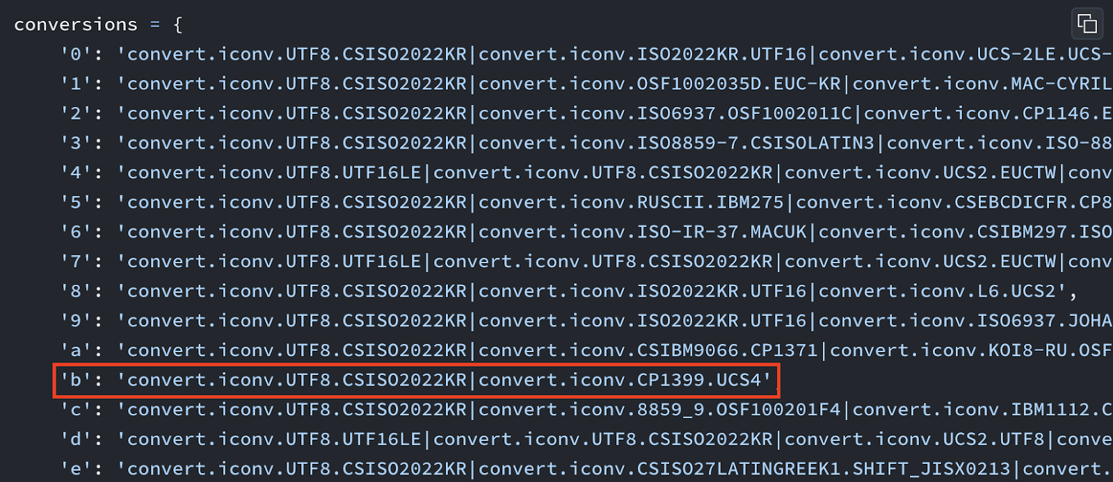 페이로드 목록에서 b 문자를 생성하기 위해 CP1399 코덱을 사용하였습니다. CP1399 코덱은 EBCDIC의 일본어 버전 중 하나의 이름입니다. (IBM-1027 코덱에 매우 근접)