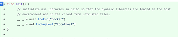 Go 패키지로부터 임의의 함수를 호출하는 docker-tar의 초기화 함수를 수정하였으며, 이로 인해 docker-tar가 container에서 chroot 하기 전에 libnss 라이브러리를 로드하게 되며, 호스트의 파일 시스템으로부터 로드한다.