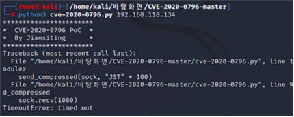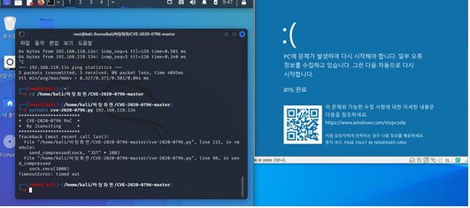 이번 학습에서는 PoC 툴을 사용하여 SMB의 취약점을 이용한 공격 중 하나인 SMBGhost로 블루스크린 현상이나 권한상승 행위를 발생시키는 실험을 해본다.
