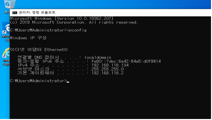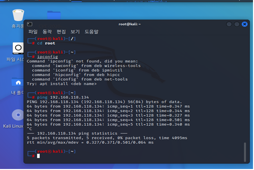 4) 공격대상(윈도우)의 아이피가 연결되어 있는지 Ping 테스트 진행