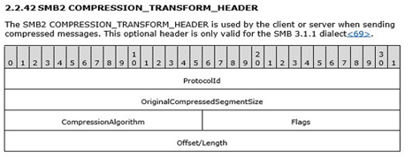 SMB2 COMPRESSION_TRANSFROM_HEADER는 통신에서 클라이언트나 서버가 압축된 메시지를 전송하게 될 때 사용되는 헤더이다. 해당 헤더는 Windows10 이후 버전에 쓰인다. COMPRESSION_TRANSFORM_HEADER의 구조는 아래 그림과 같다.