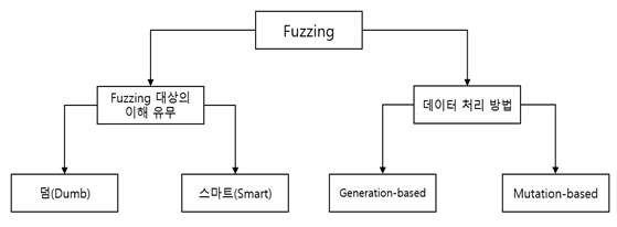 Fuzzing 기법은 크게 Fuzzing 대상의 이해 유무에 따라 덤(dumb), 스마트(smart)로 분류하고 데이터 처리 방법에 따라 생성기반(Generation-based), 변이기반(Mutation-based)으로 나눌 수 있다.