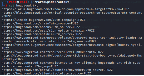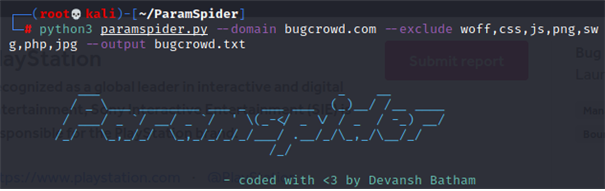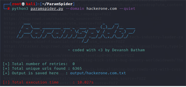 ParamSpider에서는 옵션을 설정하여 사용자가 원하는 상황에 맞게 취약점을 점검하는 것이 가능하다. 위의 표는 가능한 옵션을 나타내고 있다. 아래는 exclude 옵션과 output 옵션을 설정한 결과이다.