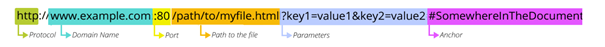 프로토콜은 자원을 접근하는 방법인 스킴 혹은 프로토콜이라 부른다. 도메인 네임(혹은 IP 주소)은 웹서버의 위치를 지정하여 찾아가기 위한 부분이다. 포트는 웹서버에서 자원에 접근하기 위하여 지정하는 관문을 말하며 표준 HTTP 포트는 80번이고 HTTPS는 443이다. 표준 포트를 사용하면 포트 번호는 생략한다. 경로는 웹서버에서 자원에 대한 경로로 추상화된 경로를 의미한다. 공백문자가 들어가는 경우 플러스 문자나 “%20”을 이용하여 치환해야 한다. 매개변수는 키와 값으로 짝을 이루며 매개변수가 여러 개면 &문자로 구분한다. 키와 값을 =문자로 구분하며 웹서버에서 어떤 매개변수를 실제로 지원하는지는 웹서버마다 다르다. 앵커는 자원 안에서 북마크 역할을 하는 요소로 해당 지점에 위치된 내용을 보여주기 위하여 존재한다. 부분 식별자라고도 알려져 있으며 요청이 서버에 보내지지는 않는다.