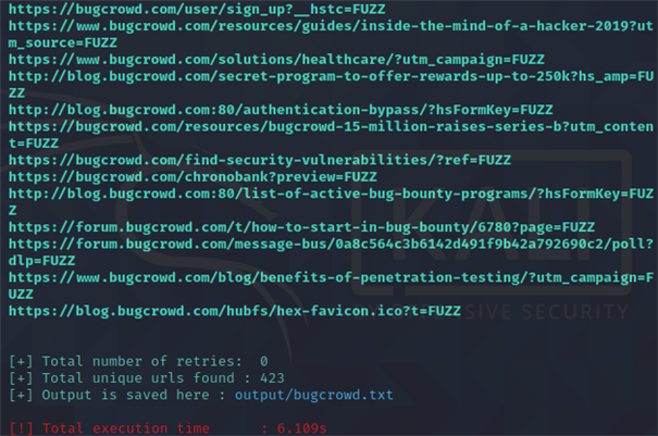 퍼징을 수행한 결과 423개의 의심가는 url을 발견하였고 제외하기로 설정된 woff, css, js, png, swg, php, jpg는 제외되고 나오는 것과 결과가 bugcrowd.txt 파일에 저장된 것을 확인할 수 있다.