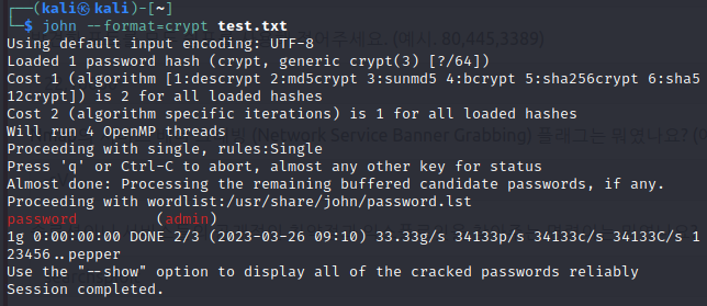 → users파일의 정보를 test.txt에 저장 후 "john --format=crypt test.txt" 명령어를 주게 되면 아래와 같이 복호화 된 패스워드를 확인할 수 있습니다. (admin, password)