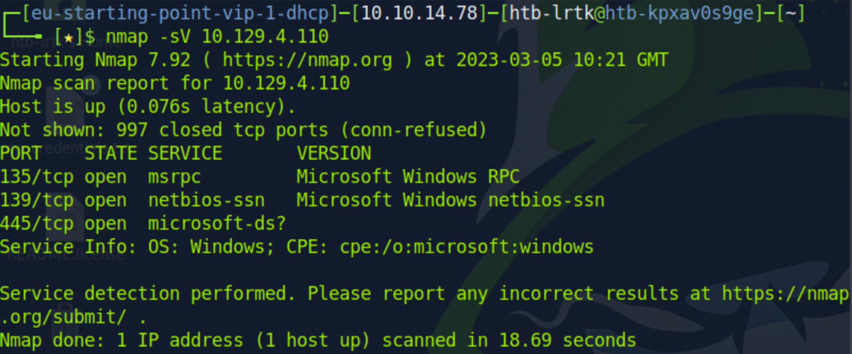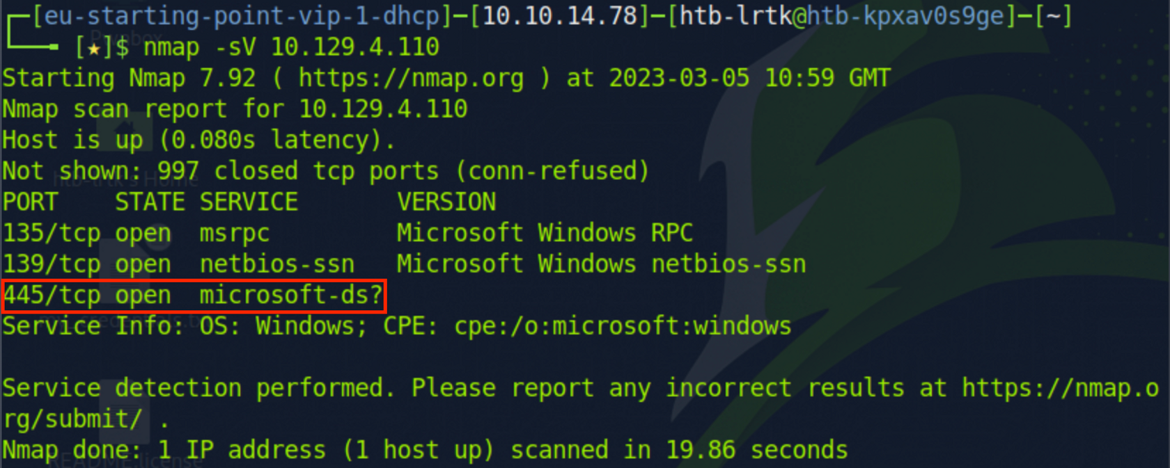번역: Nmap 스캔에서 나온 포트 445의 서비스 이름은 무엇인가요?