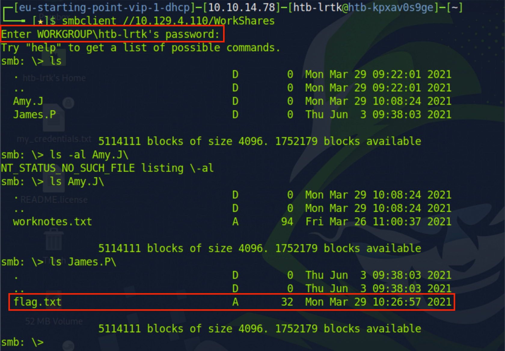 공유된 폴더 안에 파일들을 확인하니, 하위폴더인 James.P에 flag.txt 파일이 존재하였다.
