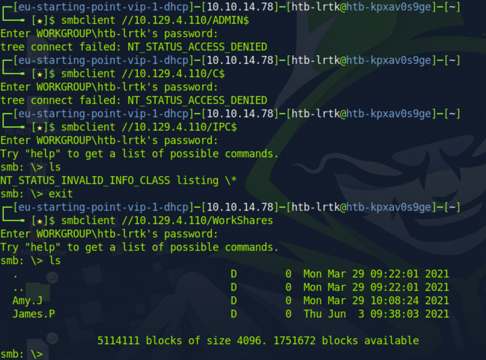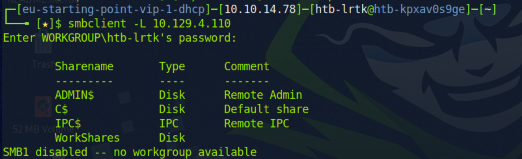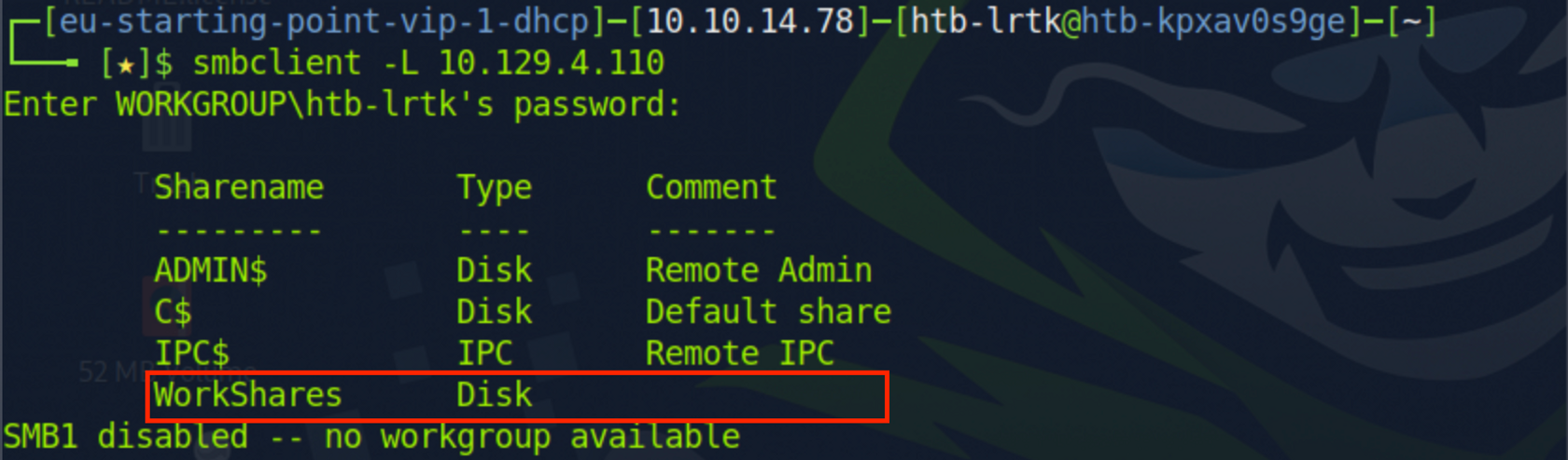 이 'flag’를 사용하면 SMB 도구가 원격 시스템의 C 드라이브(C$), Windows 설치 디렉터리(Admin$) 및 인터 프로세스 통신(IPC)을 위해 사용되는 IPC$(IPC$)와 같은 일반적인 공유 목록을 볼 수 있습니다.
