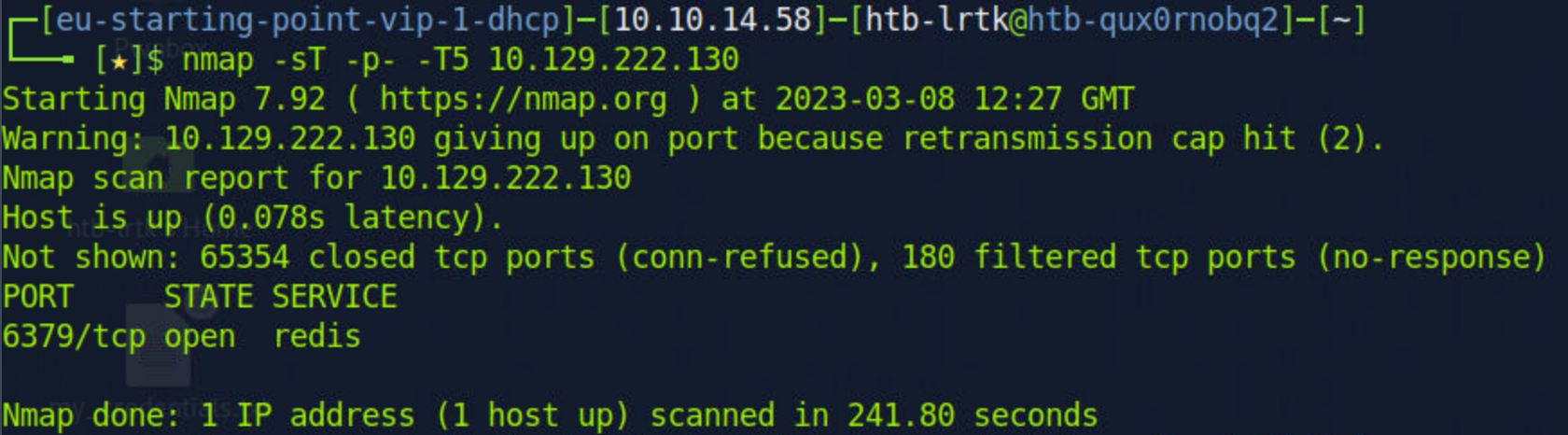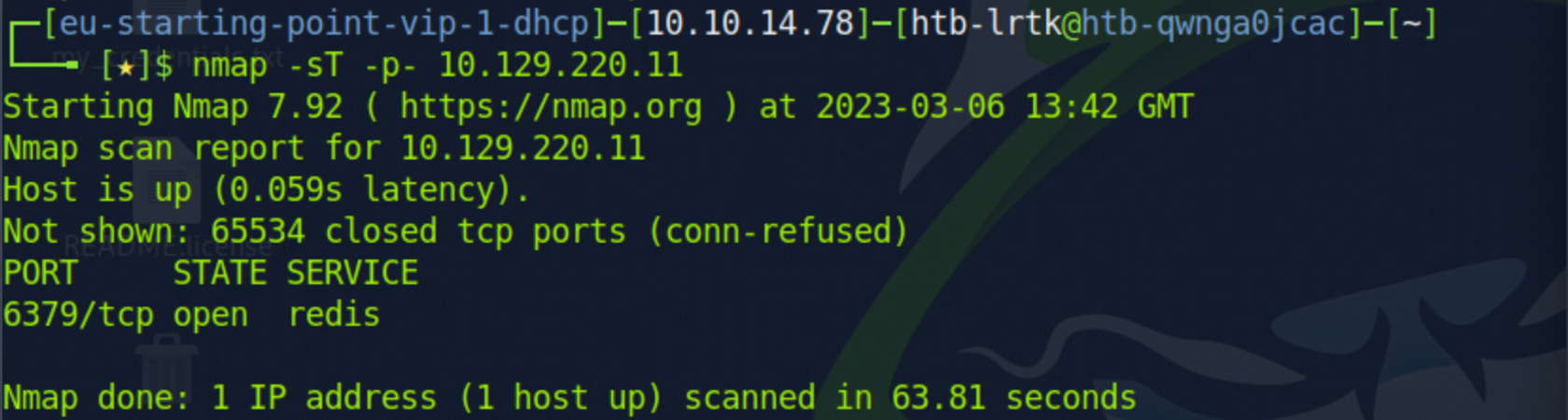 -p- 옵션을 이용하여 모든 포트를 스캔하여 정답이 출력되었다. 하지만, 결과가 나오기까지 63.81초가 걸렸다.