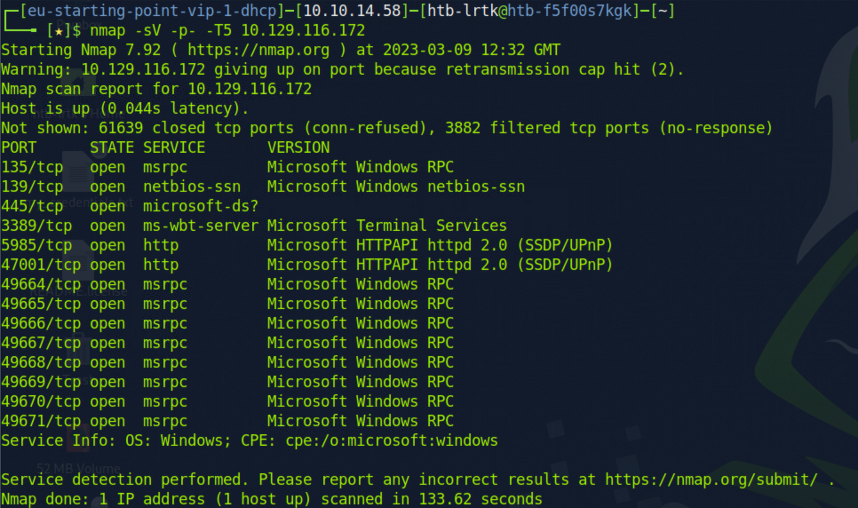 nmap의 결과 3389 포트가 열려있는 것을 확인할 수 있었다.