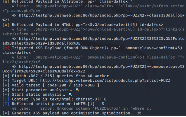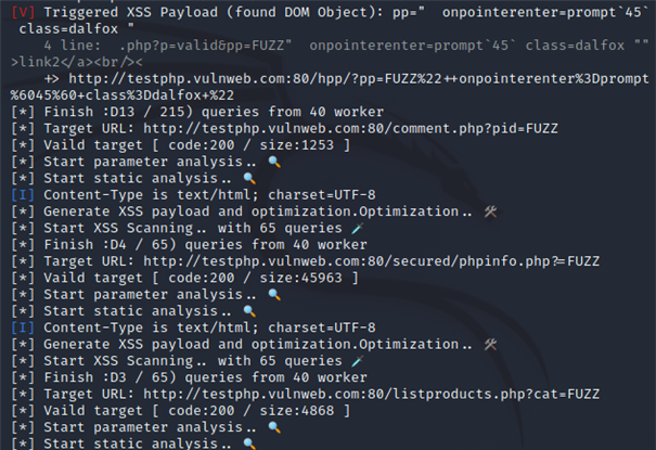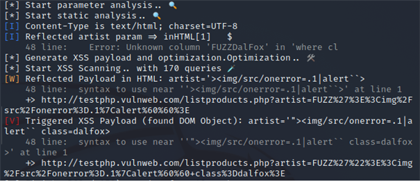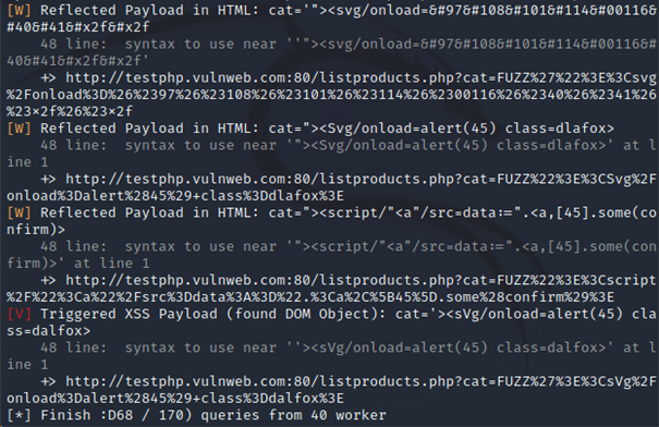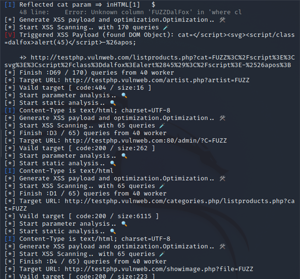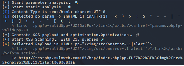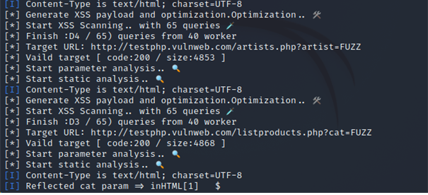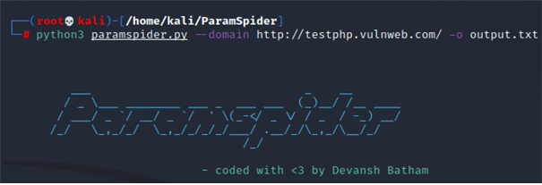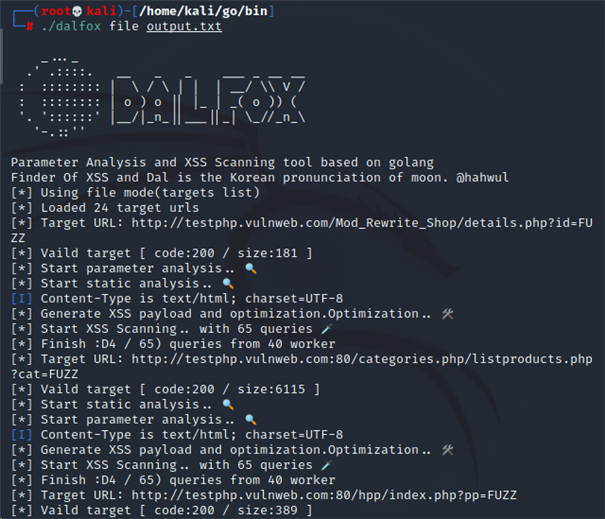 해당 도구는 파이썬 스크립트로 작성되어 있으며 옵션으로 도메인 주소를 지정하여 공격을 수행한다. 이번 실습에서는 Dalfox 툴을 사용하기 위해 XSS를 테스트할 수 있는 testphp.vulnweb.com 주소로 지정하고 공격을 수행한 결과를 output.txt 파일에 저장한다.