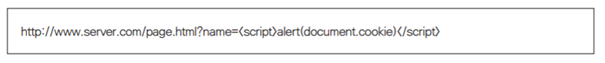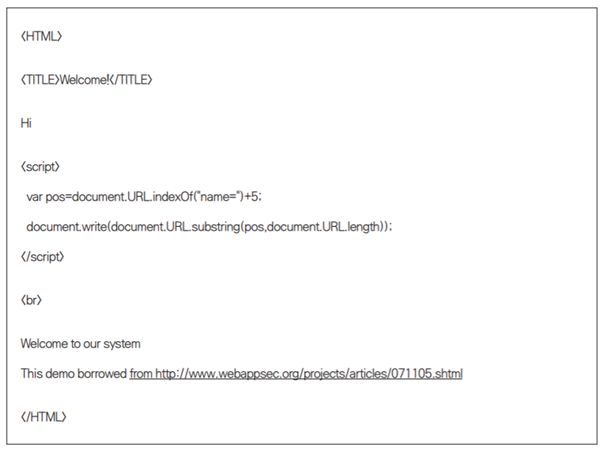 위 DOM 스크립트와 같이 개발된 DOM 페이지의 name 변수에 아래와 같이 변수를 입력하면 (http://www.server.com/page.html?name=David) 정상적으로 동작한다. 하지만, DOM 기반 XSS 공격을 위해서 [그림 11]와 같이 입력을 하면, 브라우저에서 <script>의 내용이 실행되게 된다.