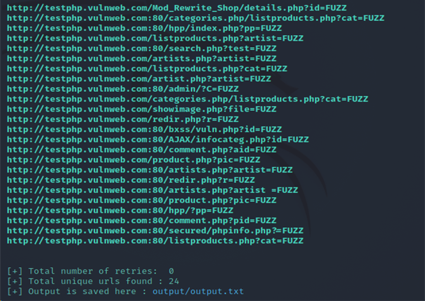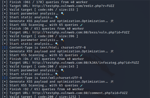 공격을 진행한 결과 총 24개의 의심의 가는 url을 발견하였고 이는 취약점일 가능성이 존재하는 경로이다. 이는 위양성을 나타낼 가능성이 존재하므로 이를 고려하여 Dalfox 툴을 사용하여 공격을 수행하여 취약점을 점검할 것이다.