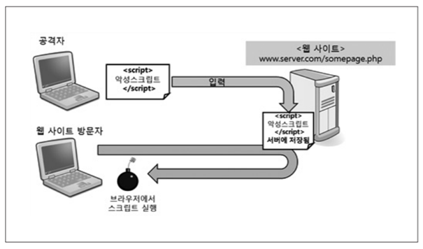 저장 XSS 공격은 그림과 같이 웹 애플리케이션 취약점이 있는 웹 서버에 악성 스크립트를 영구적으로 저장해 놓는 방법이다. 이때 웹 사이트의 게시판, 사용자 프로필 및 코멘트 필드 등에 악성 스크립트를 삽입해 놓으면, 사용자가 사이트를 방문하여 저장되어 있는 페이지에 정보를 요청할 때, 서버는 악성 스크립트를 사용자에게 전달하여 사용자 브라우저에서 스크립트가 실행되면서 공격한다. 가장 일반적인 방법은 게시판 같은 곳에 HTML 문서에 <script>를 이용하여 이 스크립트 태그 안에 악성 스크립트를 저장하는 방식이다. 즉, 텍스트만 표시되도록 설계된 어떤 게시판에<script> “악성 스크립트” </script>과 같은 태그를 포함한다. 이 경우에 게시판에는 태그가 나타나지 않으며 사용자는 확인할 수가 없다.