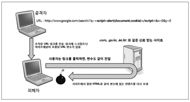 반사식 XSS 공격은 웹 애플리케이션의 지정된 변수를 이용할 때 발생하는 취약점을 이용하는 것으로, 검색 결과, 에러 메시지 등 서버가 외부에서 입력받은 값을 받아 브라우저에게 응답할 때 전송하는 과정에서 입력되는 변수의 위험한 문자를 사용자에게 그대로 돌려주면서 발생한다. 일반적으로 서버에 검색 내용을 입력하면, 검색 결과가 있는 경우에는 결과값을 사용자에게 전달하지만,