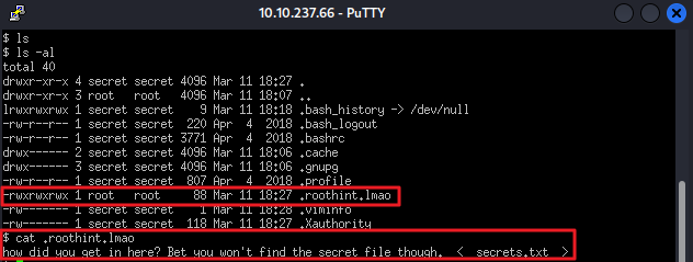 1.박스의 어떤 포트들이 열려있나요? 2.웹서버의 검색엔진 최적화(SEO)에 쓰이도록 만들어졌지만, 잘못 설정될 경우 원치않은 디렉토리나 페이지를 유출할 수 있는 파일 이름은 뭔가요? 3.첫번째 플래그를 찾은 페이지는 뭐였나요? 4.secret 유저의 비밀번호는 뭔가요? 5.첫번째 플래그는 뭔가요? (보너스!!) 파일시스템 어딘가에 숨겨져 있는 두번째 플래그는 뭔가요?