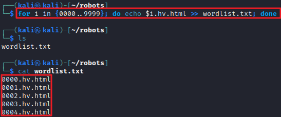 →0000~9999를 반복해서 $i 인자.hv.html을 wordlist.txt에 넣어 저장